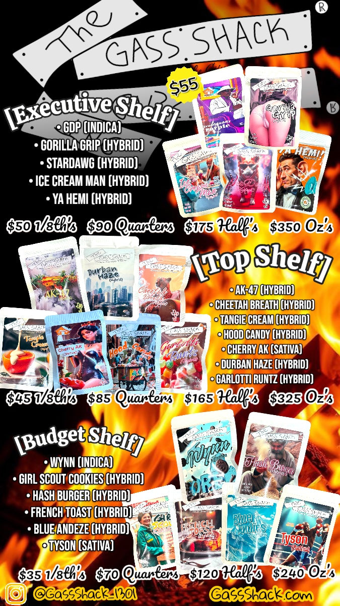 This Is a Legendary Strain Drop for The TRUE CONNOISSUER!! We Have Some Bad Ass Heavy Hitting Indica's, & Even Our Happy Medium Hybrids That We ALL Love!! Catering To Any Desired Palette from Pure Candy Gass, Smooth Cream, & Of Course Our GASS SHACK®️ Octane Strains!! (MAKE SURE TO CHECK OUT OUR PRIVATE RESERVE)